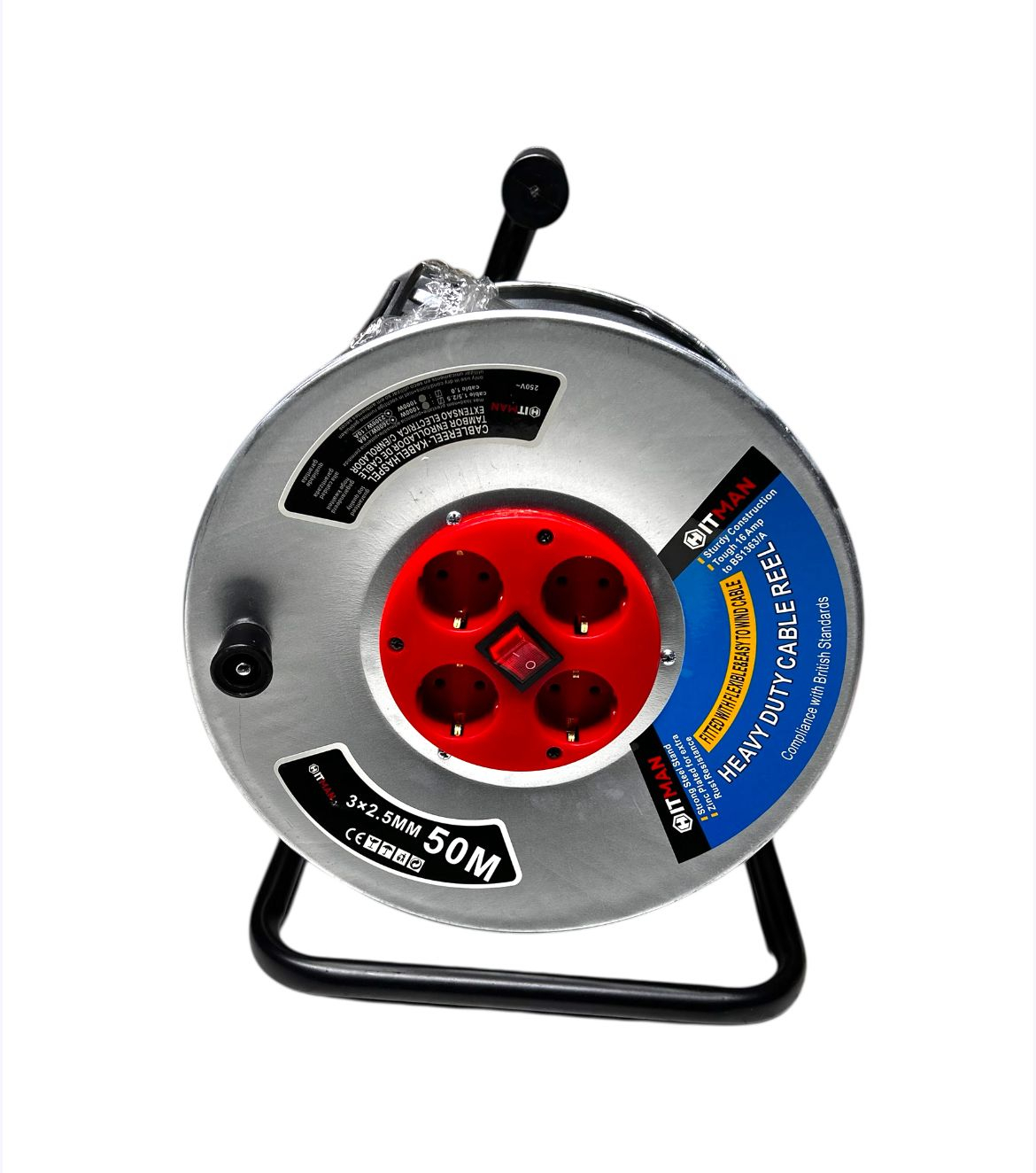 Prelungitor Rola curent Metal 50M 3X2,5 HITMAN,Ai nevoie de putere și mobilitate pe șantier, în atelier sau în grădină? Prelungitorul tip rolă de 50 metri este proiectat pentru utilizare intensă și profesională. Cu un cablu masiv de 3x2.5mm, acest tambur asigură un flux stabil de energie fără riscul de supraîncălzire, fiind ideal pentru scule electrice de mare putere precum aparate de sudură, compresoare sau generatoare.