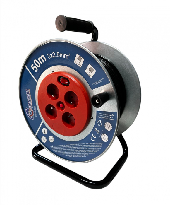 Prelungitor electric pe tambur metalic, lungime cablu 50m, secțiune 3x2.5mm, putere maximă 2800W. Ideal pentru șantier, atelier sau gospodărie. Include protecție termică și construcție rezistentă pentru utilizare intensivă.